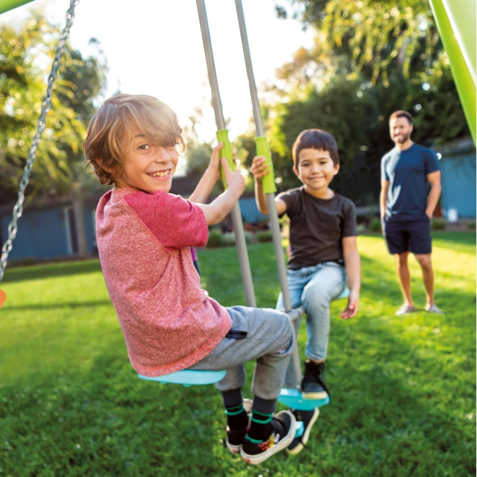 -1 columpio que puede transportar hasta dos niños simultáneamente y cuenta con reposapiés y agarraderas antideslizantes para mayor estabilidad.