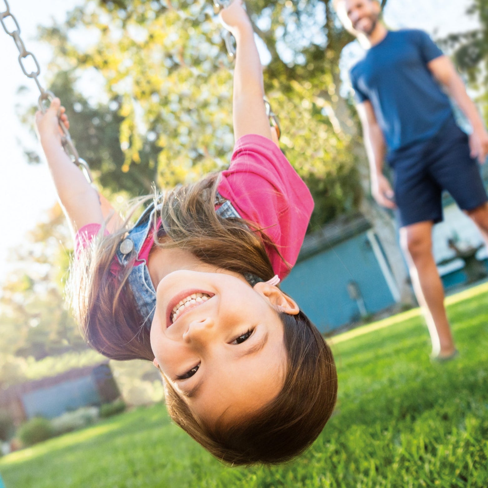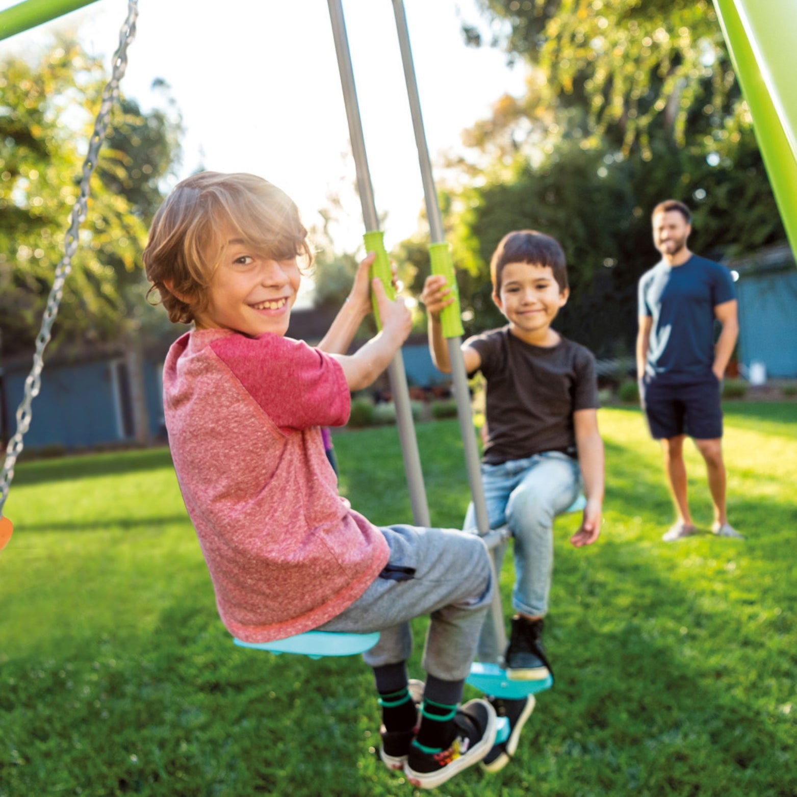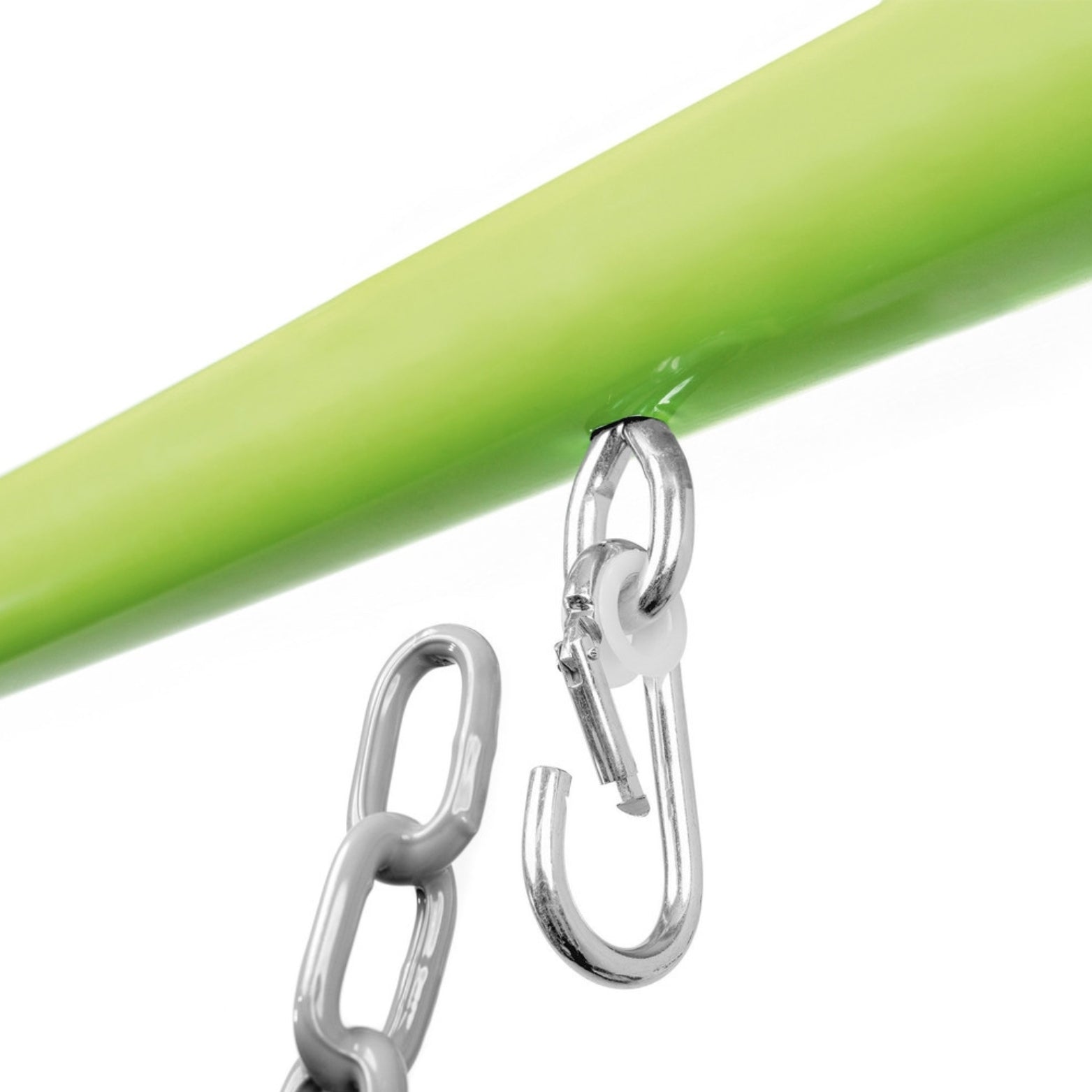 Materiales: estructura con tubos de acero galvanizado de 6 cm con recubrimiento epoxi (resistente, segura y robusta), columpio con asiento de PVC (flexible y resistente) y cadenas recubiertas de plastisol (evita rozaduras y protege contra la oxidación)