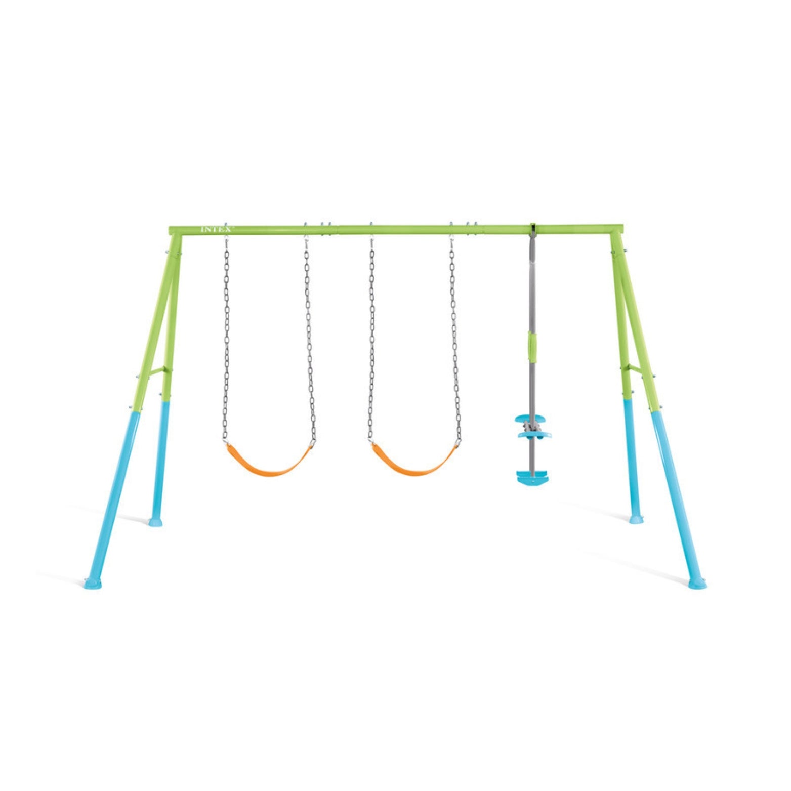 Diseño: conjunto color verde, azul, naranja y gris compuesto por 2 hamacas individuales con cadenas ajustables y 1 balancín de dos plazas con agarres antideslizantes y cómodo reposapiés